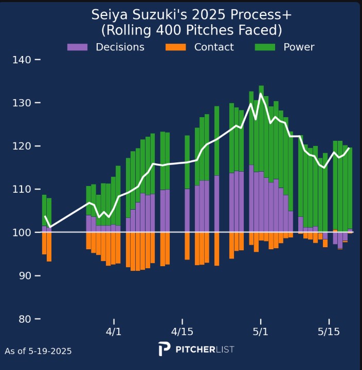 Suzuki was slumping a bit in May, mainly due to a slump in his decision-making, which went from very good to below league-average in a span of two weeks. But he appears to be turning that around. And as he’s surrounded by potential league MVP Kyle Tucker, Pete Crow-Armstrong, and Dansby Swanson, he’s become a monster in run production, chipping in seven combined Runs and RBIs in last night’s game. He’s now second in the National League in RBIs and his twelve home runs are already more than half his total last year (21).