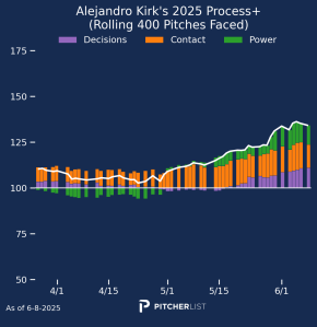 The hottest catcher in the game right now might be Alejandro Kirk, who boosted his season slash line to .316/.361/.421 after Monday’s four-hit performance. Though he isn’t exactly known for his power, Kirk hit his fourth home run in the eighth on Monday before ripping his second double of the night in extras to bring home the game-winning run. Per his Process+ chart, Kirk has demonstrated good decision-making and contact ability all season, but the power has come around over the past month. He’s red-hot right now and worth picking up if you’re lacking production at catcher.