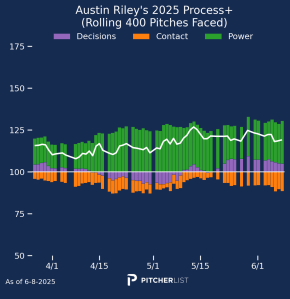 Austin Riley is one player I’ve oddly seen catch a lot of flak lately as a perceived “bust” compared to his second-round ADP, yet he’s producing at a respectable clip in almost every category after recording four multi-hit performances in his past five games. The return of Ronald Acuña Jr. should continue to be a boon for Riley and the rest of the Atlanta lineup, and by season’s end, we’ll likely be looking at yet another productive all-around season from the star third baseman. The best sign of life for Riley lately is the improvements to his decision value in his Process+ chart, which, when coupled with his always-impressive power, should pay dividends in the summer months.