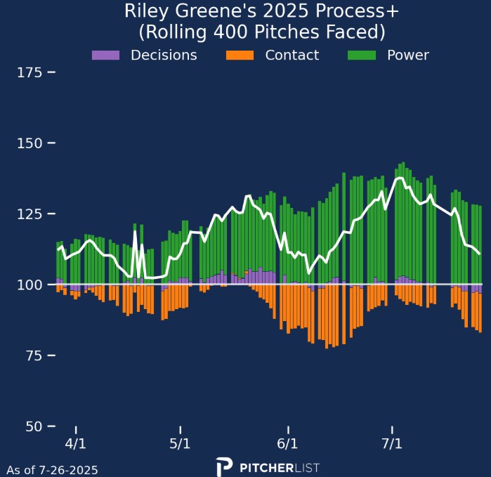 Greene had been struggling all month as the strikeouts have gotten the best of him (he’s got 40 in July), but he showed out last night with three extra-base hits. He’s lapping the league in K’s with 144 (which will smash his career high last year of 156), but the selling out for power hasn’t hurt his overall game—in fact, it’s done the opposite. Greene’s batting an unlikely .275 (which, with a 32.6% K-rate, is insane) and has the highest OPS of his career. While he might be on a downward trajectory of late, the data shows he usually rebounds quickly from a slump.