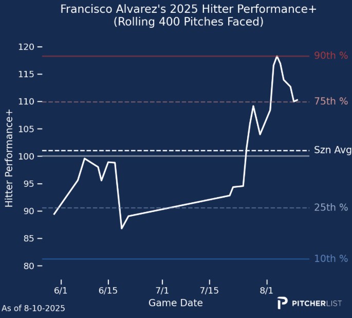 So what’s propelling this resurgence? At age 30, Alonso is simply hitting the ball harder than he ever has, even his 53-homer season in 2019. His 93.3 mph Average EV is over two mph above his career-best, and his barrel rate is 5% above his historic average. Here’s how his 2025 campaign compares to last year: