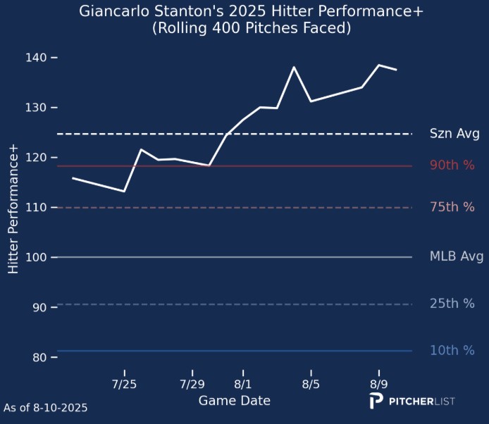 Last year, Ramírez came within a home run of going 40-40. While his homer pace hasn’t quite been the same in 2025, he’s got twelve since July 1st and 35-35 is well within reach (he only needs two more steals). You simply have to marvel at his consistency as he puts up monster numbers in a subpar lineup year after year. His two-homer night came on his first and last at-bats, and while they weren’t monster shots like Stanton’s (both were <100 mph), they counted the same. Ramírez surprisingly barrels the ball just 7.5% of the time and has a below-average bat speed, but he’s also hit 26 more homers than Pete Alonso in his career, so clearly it’s working.