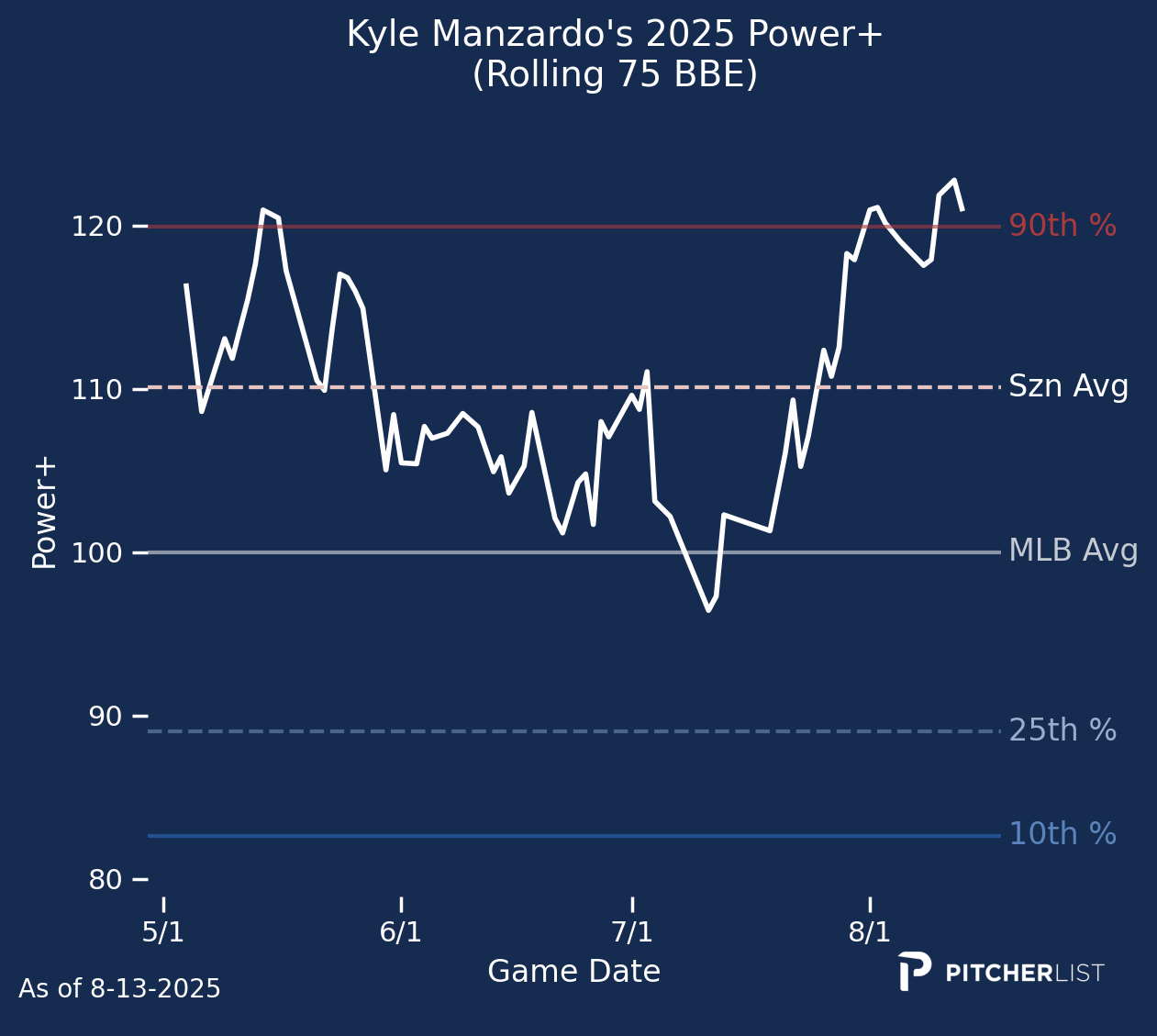 Not a huge line last night from Manzardo, but he has been quite productive lately, posting a .957 OPS since July 1st. As you can see below, his batted ball data support the recent surge. Manzardo’s 25.5% strikeout rate isn’t too bad as a first base slugger. His splits against lefties remain a weakness, but at the same time, 60 plate appearances is hardly a representative sample size. I’d like to see him get more chances against lefties. Either way, he has done a yeoman’s work, providing the Guardians with much-needed punch in the middle of their order. 21 homers and a 123 wRC+ are nothing to sneeze at.