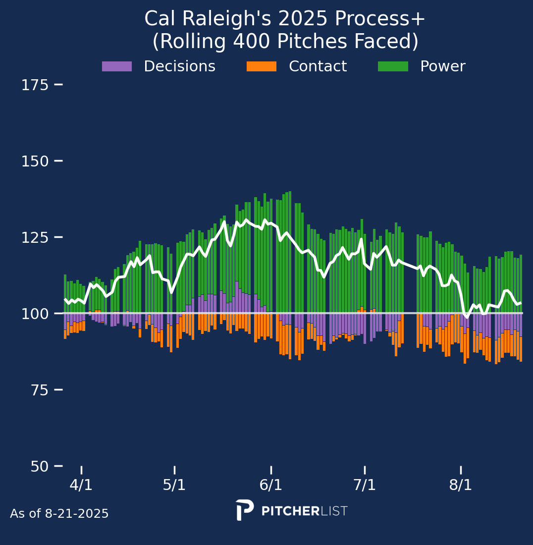 Raleigh’s Process+ numbers have actually been slipping lately since the All-Star break (Home Run Derby curse, anyone?), and some of his lowest contact and decision-making metrics of the season are evident not only in the chart below, but also in his .222/.295/.530 slash line over the past 30 days. Still, his power metrics are alive and well, and have been high throughout the season, as Raleigh keeps finding a way to crush balls over the wall.