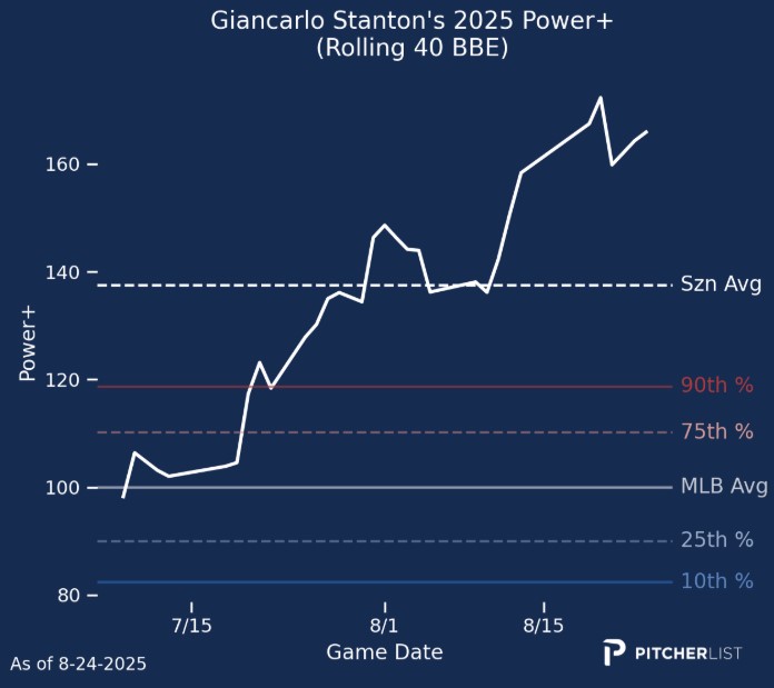 Soto and Lindor are both special, but make no mistake: Pete Alonso is the Mets’ MVP this season. Perhaps driven by some extra motivation in a contract year, his Average EV is now above 93 mph, and his barrel rate is 18.6%. On a four-hit night, including a bases-loaded double that sparked a five-run inning, all he did was hit the ball hard, with two hits clocking in at 110 mph. He’ll finish the year as the best fantasy First Baseman in the league.