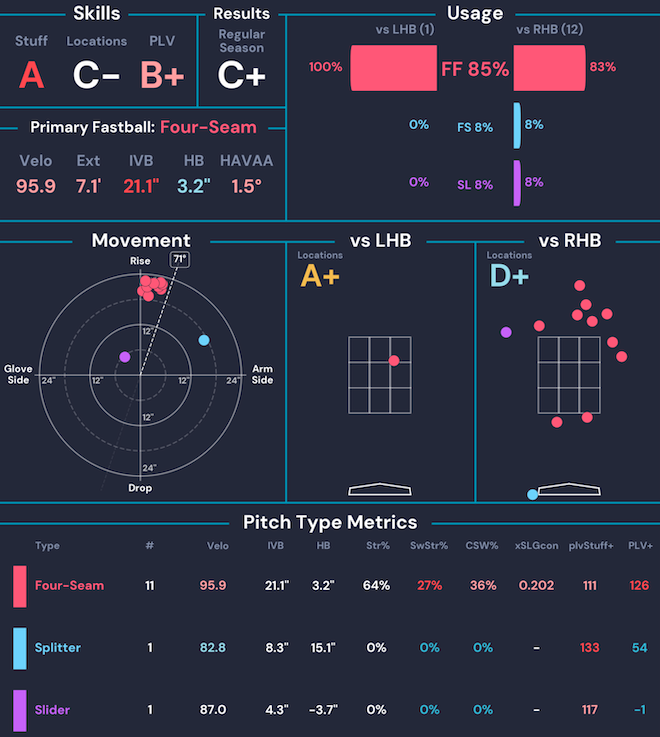 Brennan Bernardino (W) — 1.0 IP, 0 ER, 0 H, 0 BB, 0 K, 2 Whiffs, 18.2% CSW. Great command for Bernadino in this one, got him through the inning but it’s not worth chasing.