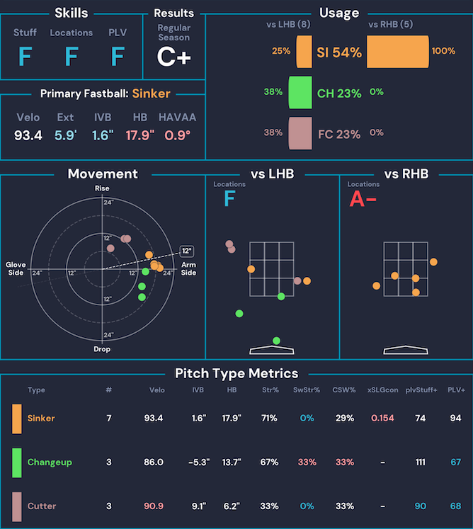 Tyler Kinley — 1.0 IP, 0 ER, 0 H, 0 BB, 1 K, 2 Whiffs, 40.0% CSW. Slider remains good, just have to worry about how hittable his fastball can be.