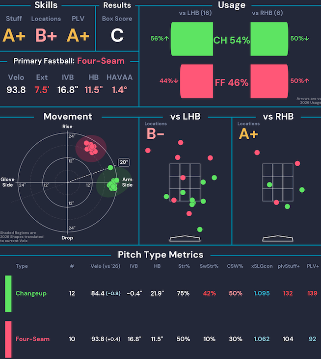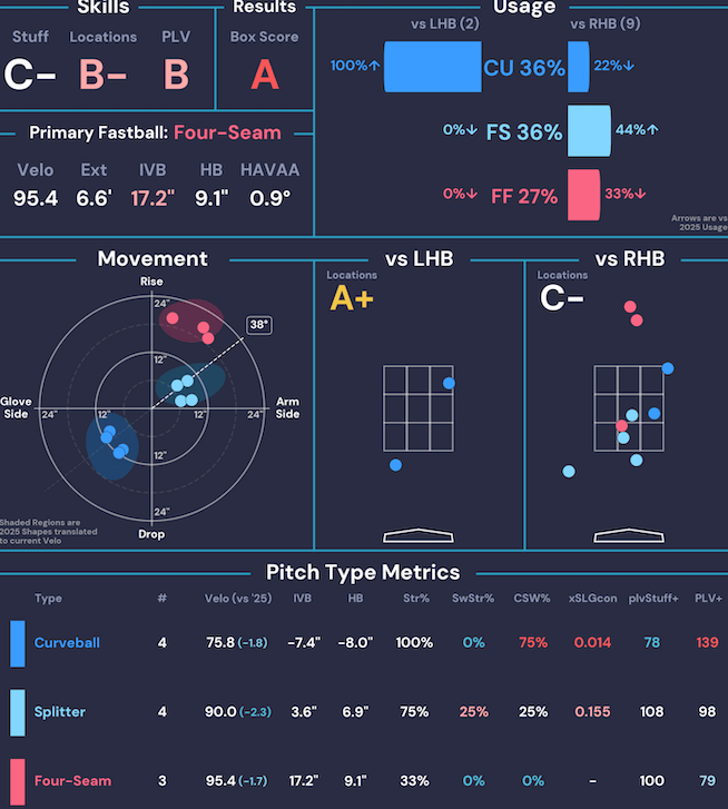 | Peyton Gray | 1.0 IP | 0 ER | 0 H | 0 BB | 1 K | 3 Whiffs | 40% CSW |