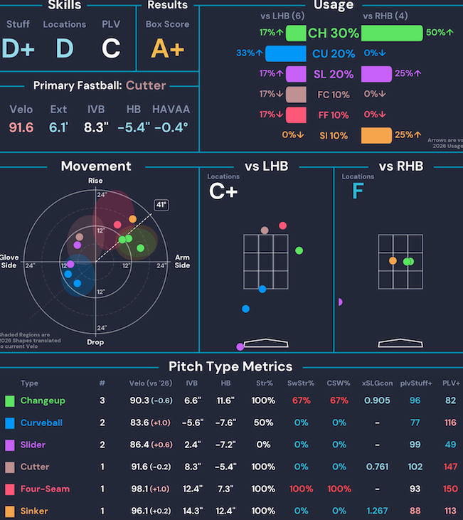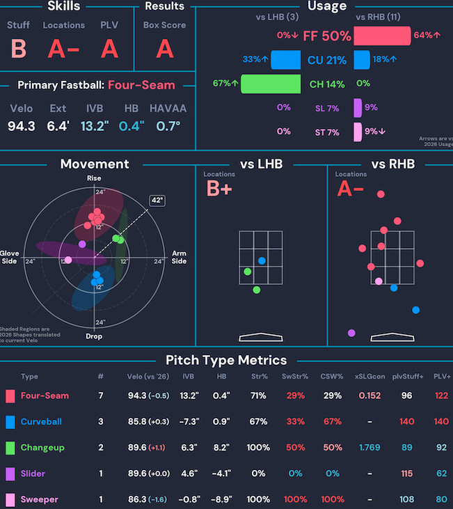 | Mason Fluharty | 1.0 IP | 0 ER | 0 H | 0 BB | 2 K | 3 Whiffs | 46% CSW |