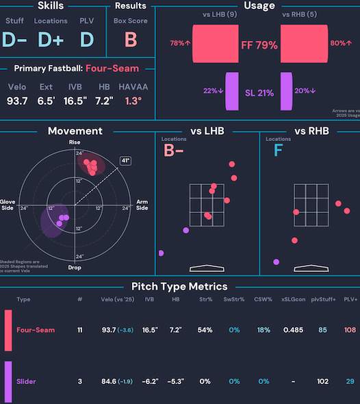 | Braydon Fisher | 1.0 IP | 0 ER | 0 H | 1 BB | 0 K | 0 Whiffs | 21% CSW |
