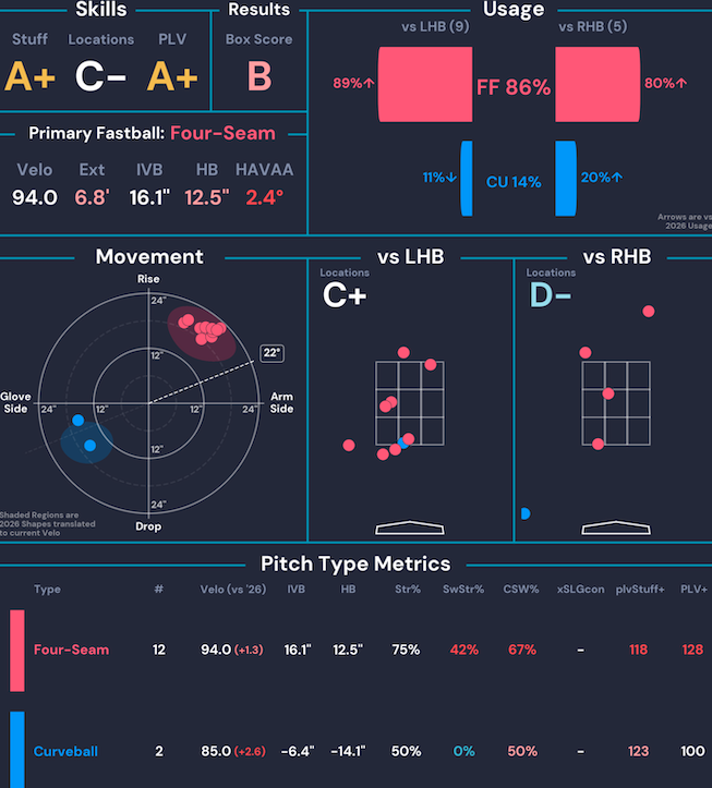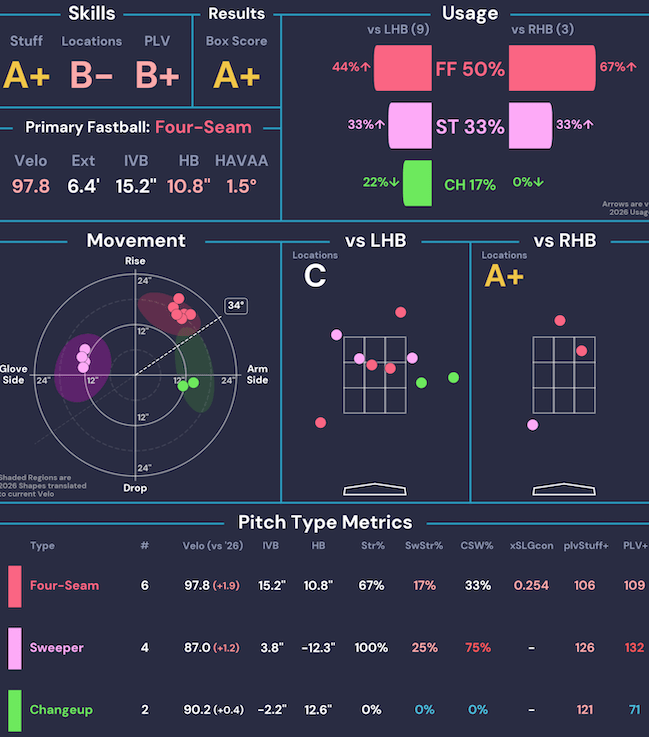 | Jack Dreyer | 1.0 IP | 0 ER | 1 H | 0 BB | 2 K | 5 Whiffs | 30% CSW |