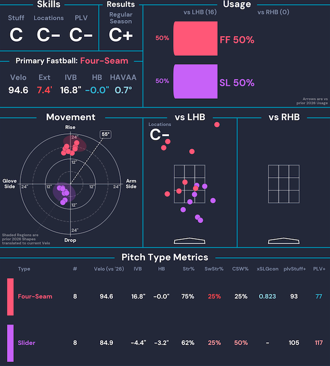 | Lake Bachar | 1.0 IP | 2 ER | 2 H | 2 BB | 2 K | 6 Whiffs | 41.7% CSW |