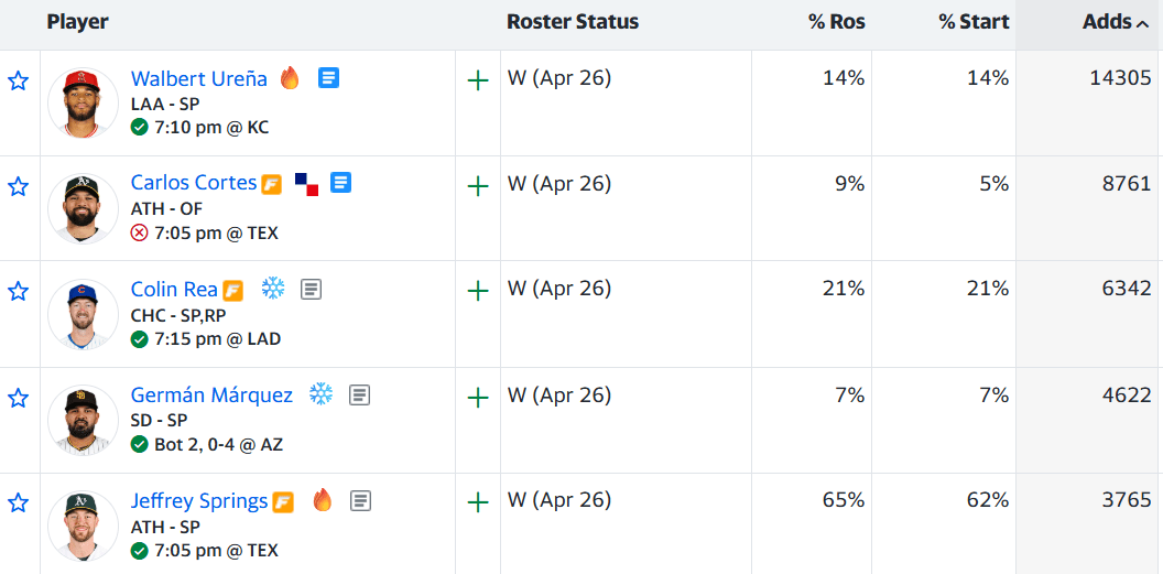 Welcome to the Waiver Wire Picks, our daily fantasy baseball article that looks at the best players in baseball that you should be adding to your rosters. We’ll look at the players that are likely to be available in most leagues, as well as some deep league waiver wire options, and we’ll also look at the most added players in fantasy baseball across the major sites, and let you know which players to add, and which players you can leave on the wire.