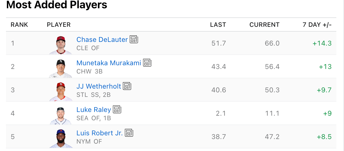 This is a pretty simple case where all of these are worthy pickups who have started off strong, including Chase DeLauter, Munetaka Murakami, JJ Wetherholt, and Luis Robert Jr. Jr. DeLauter and Wetherholt were two of my favorites going into the season, and the excitement has only grown after their hot start.