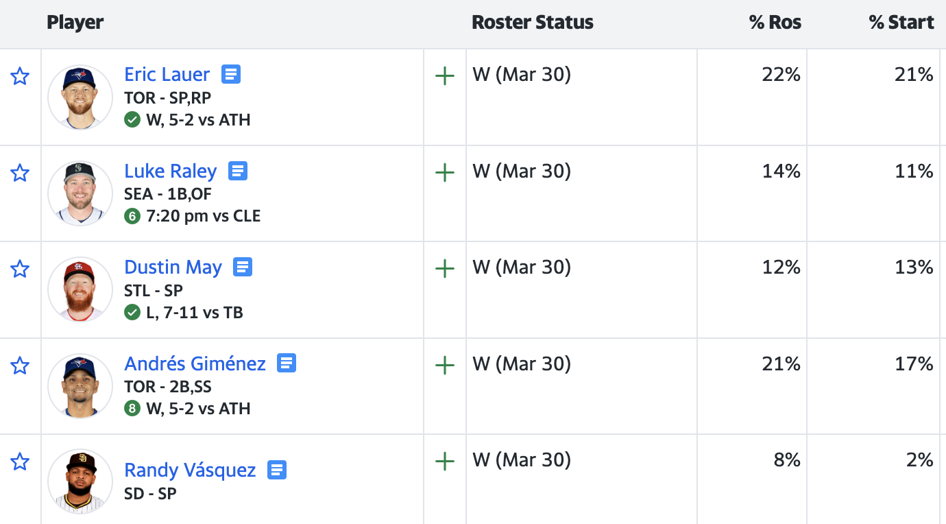 As highlighted in Nick’s SP Roundup from Saturday’s action, Randy Vasquez is an interesting speculative add option. He had a nice debut to the season against the Detroit Tigers, and has a favorable matchup hosting the Colorado Rockies upcoming in the future as well.