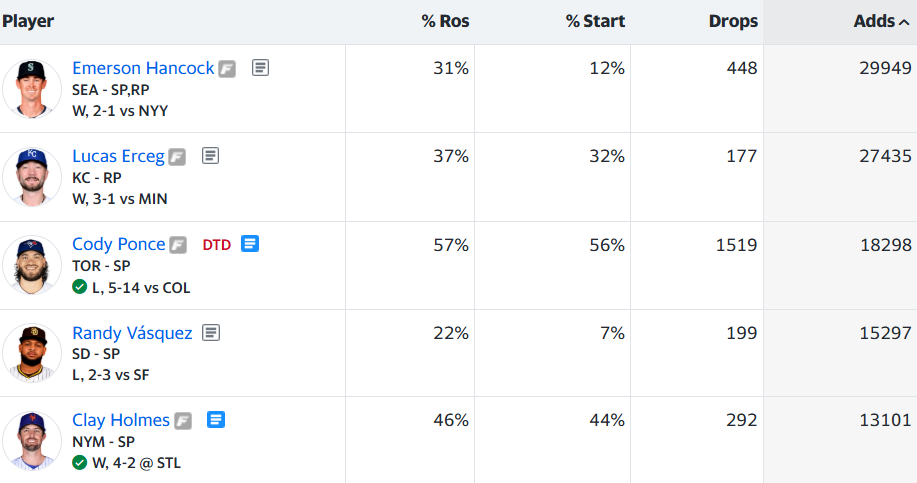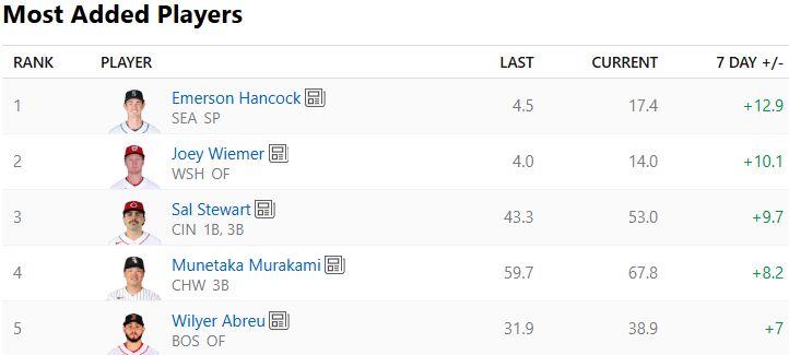 The most added list on ESPN also features Hancock at the top, with four hitters following suit. Munetaka Murakami and Sal Stewart are two rookies who have gotten off to fast starts. Murakami has three home runs already, and Stewart has gone 8-for-12 with one homer, three doubles, and five walks. Both are already highly rostered, but definitely pick them up if they’re somehow available. The same can be said for Wilyer Abreu, who is already rostered in most leagues on other sites and is set for another year as a solid outfielder for fantasy. The only name on this list that is widely available is Joey Wiemer, who has two home runs so far this year. While it’s nice to see it from the former prospect, it’s not enough to rush to the waiver wire to add him.