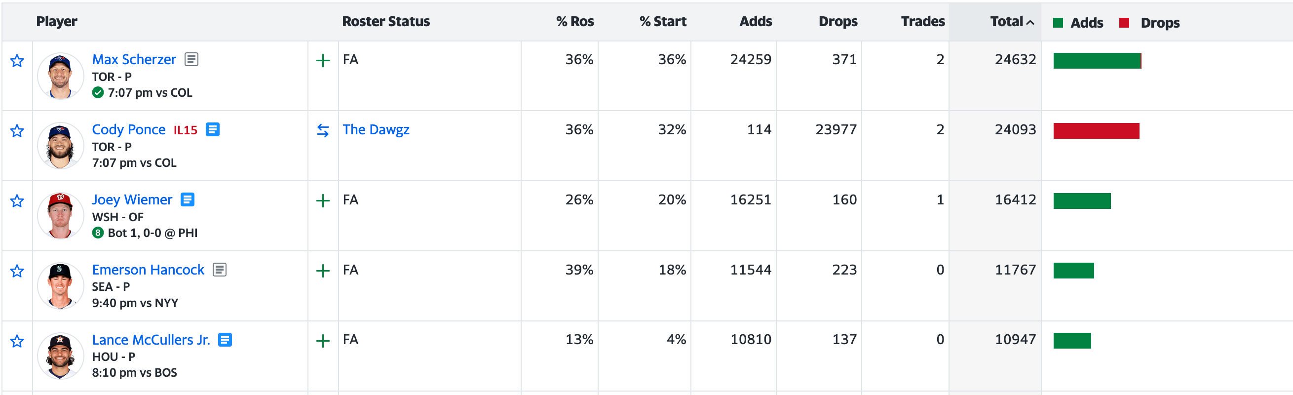 Mad Max Scherzer is still kicking and tops today’s top adds with a sweetheart home match-up against the Rockies. I wouldn’t read too much into this start when it comes to evaluating Scherzer for the rest of the year. He was scoreless in 13.2 innings during the spring, but his strikeouts are down, and his walks are up. His 5.19 ERA last season is an indicator that he’ll be lucky to be more than a streamer this year – but you might as well stream him in spots like this.