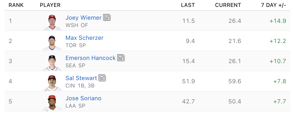 José Soriano was someone I wrote about on this same date exactly one year ago. He was 29% rostered at the time, and I wrote, “What if you took Framber Valdez and gave him three more ticks of velocity on every pitch? Soriano is an elite groundball pitcher coming off a stellar season opener where he went seven scoreless innings. Yes, it was the White Sox, and yes, he only notched five strikeouts, but Soriano looks like he’ll be a Quality Start machine… This is the guy the Angels should be building around.” I stand by all of that with two small updates for this year: he’s gone 12 scoreless with 11 strikeouts now across two starts, this time against the Astros and the Cubs. He had a rough spring, but he’s looking so very back. This is the guy to get if he’s still available.