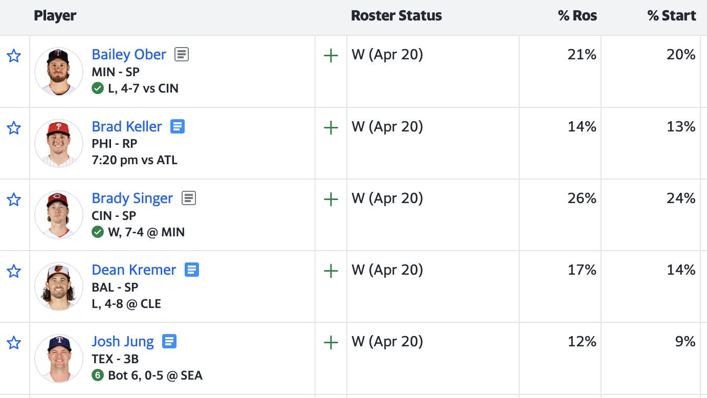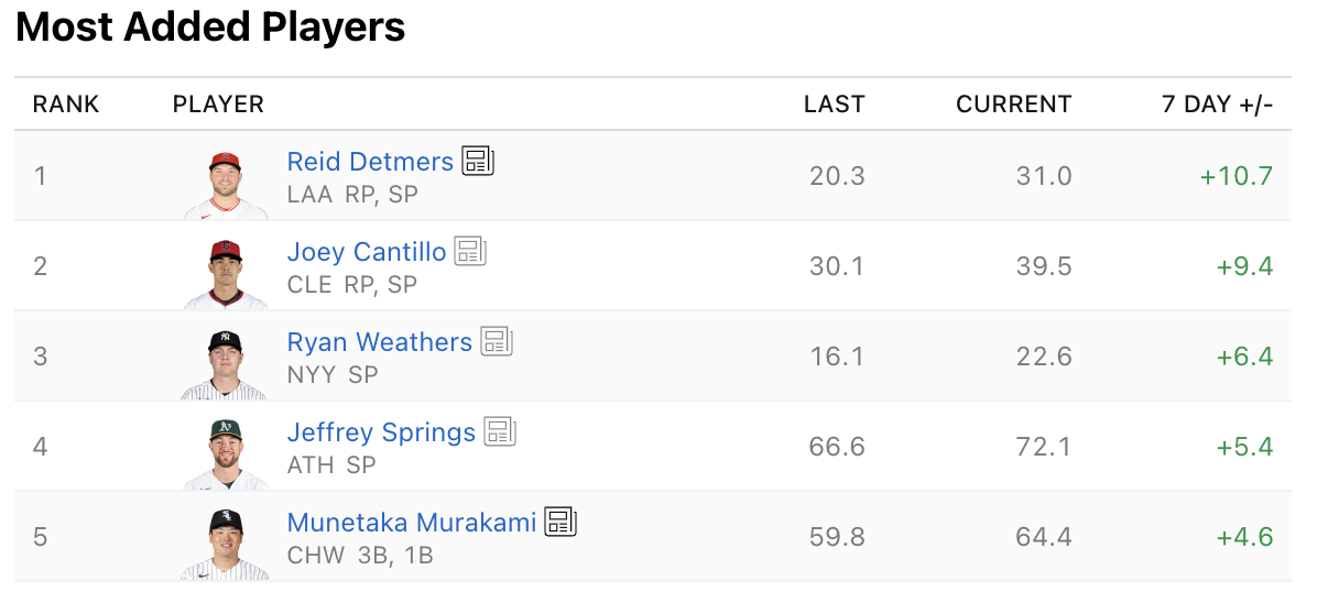 Lambert is a deep cut, considering he’s not owned in any leagues on Yahoo at the moment. This felt like a good spot to mention him, after a debut for the Houston Astros on Friday, where he struck out eight while generating 23 whiffs on 90 pitches. It wasn’t otherwise a particularly good start, as he allowed four earned runs in five innings, which is probably also why nobody noticed. This definitely comes out of nowhere, but what’s great about starting pitching emerging on the waiver wire is exactly this. Someone whose never been interesting all of a sudden comes back a different pitcher and version of themselves we’ve never seen before. So I’m interested in him as a spec add, and he gets a favorable matchup this week as well. He’s lined up to face the Cleveland Guardians on Wednesday, so keep an eye on him to see how that start goes.