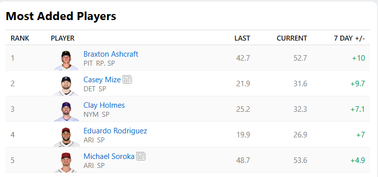Braxton Ashcraft is the most interesting option here on ESPN. It’s getting more difficult by the moment to ignore his success; his most recent outing against the Nats netted seven punchouts and a Gallow’s Pole. The 25-year-old righty owns a 22% K-BB% through four starts and deserves to be rostered until further notice.