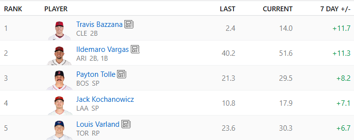 There’s unfortunately not much to talk about regarding the ESPN most-added list, as we’ve already discussed Bazzana, Vargas, and Kochanowicz above. The remaining two, Tolle and Varland, are the next two players discussed in the two sections below. In short, Tolle is worth adding in all leagues, as he has legitimate ace upside, and Varland is a must-add wherever you need saves.