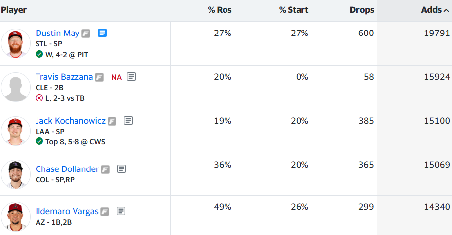 Dustin May leads the most added list on Yahoo, as he was a popular streaming option both for Monday and in weekly leagues as a two-start pitcher. He delivered six solid innings, allowing two runs on two hits and two walks with two strikeouts. It looks like he’s settled down after his first two rough starts of the season, making him worth holding onto for now. We’ve already discussed Bazzana, which brings us down to Jack Kochanowicz, another Monday streamer. He delivered a quality start, allowing two runs over six innings, and has also been on a solid run as of late. I don’t like him as much as May, but he’s a fine streaming option moving forward.