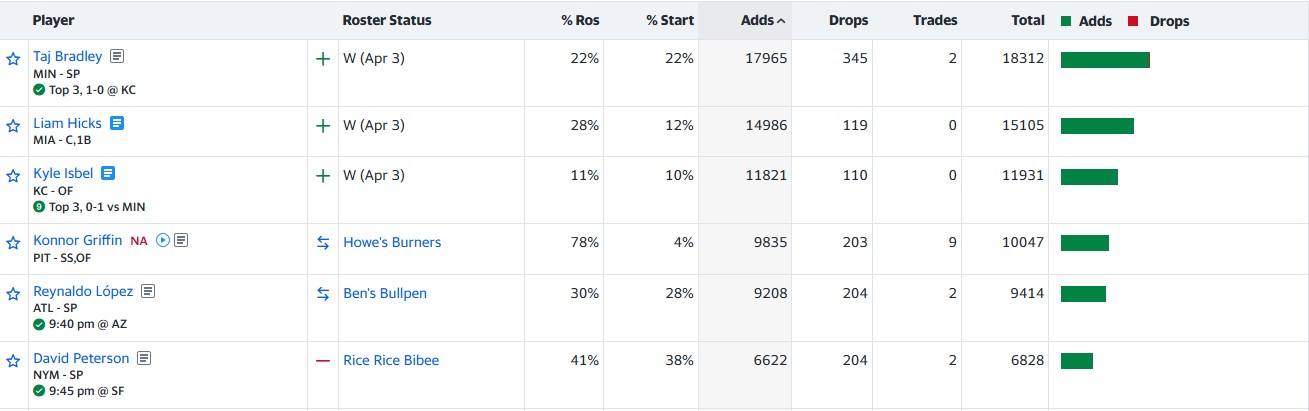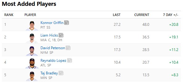 ESPN has basically the same set of guys, only in a different order. Hicks and Griffin lead the pack, with the streamers directly after. A little bit farther down the board, Carlos Correa is warranting attention after getting five RBIs over his last two games, including a homer on April 1. Eligible at both Shortstop and Third Base, Correa still has some left in the tank, and being reunited with his old squad appears to have rejuvenated the former first-overall draft pick.