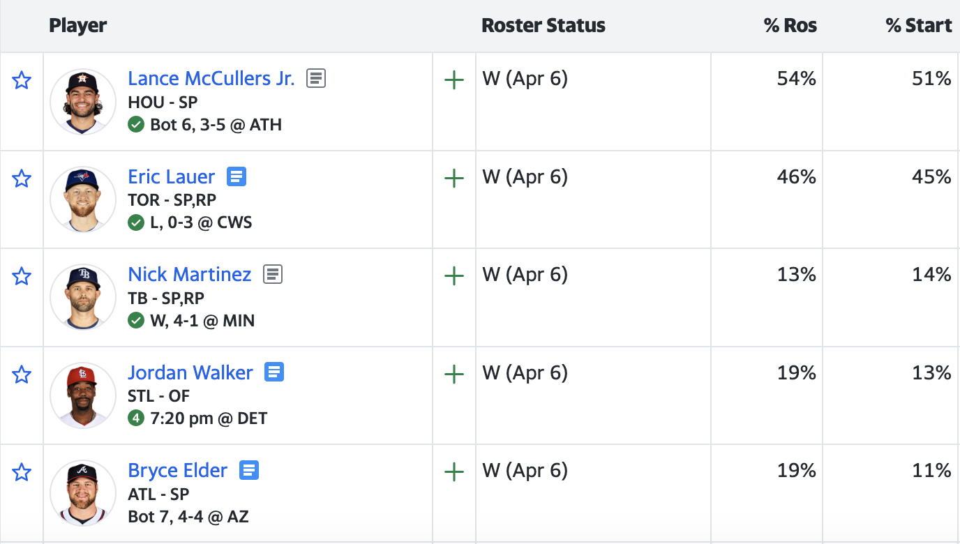 The most added players on Yahoo is not a list of starting pitchers I’m particularly interested in, but if I had to choose one to highlight, I would point out Bryce Elder. He’s not the most exciting pitcher on the planet, but he’s good at being efficient and pitching deep into games, and he has a clear rotation spot on an Atlanta Braves team that should win a lot of games.