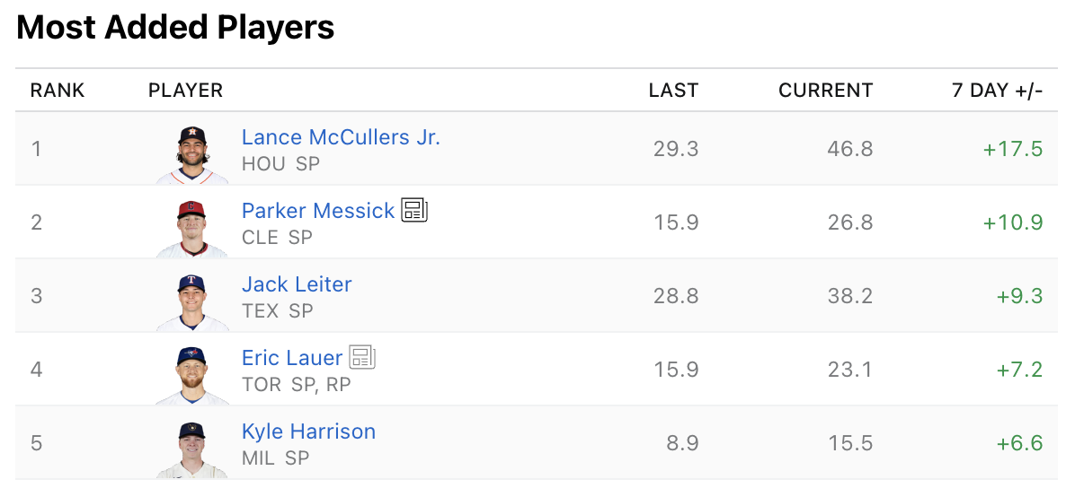 The most added players on ESPN highlights some starting pitchers who are much more intriguing. Through two tough starts against the Los Angeles Dodgers and Chicago Cubs, Parker Messick has an impressive 0.82 ERA and should be picked up anywhere he’s available.
