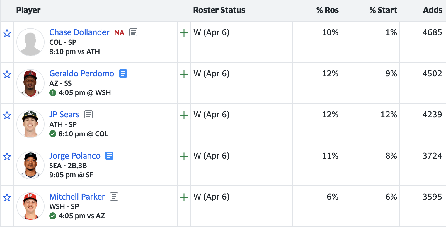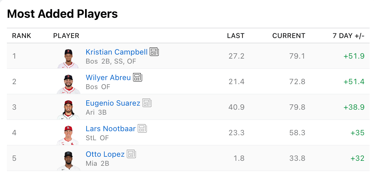 Most of these players have been featured repeatedly in this section this season, and there’s not much left to say about them. Kristian Campbell and Wilyer Abreu have both been phenomenal for the Red Sox, and both deserve to be owned in basically every league at this point. Eugenio Suárez has a proven track record as a power hitter, and he’s absolutely crushing the ball to start the year. Lars Nootbaar has solidified his spot as the Cardinals’ leadoff hitter and appears poised for a breakout after posting years of solid underlying metrics.