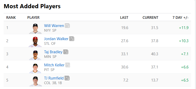 Will Warren got the A’s in Yankee Stadium last night and was inefficient, allowing eight baserunners before being yanked with two down in the fifth. The outcome wasn’t what you wanted, but I still think he’s worth a roster spot given his strikeout upside while pitching for a winning team.