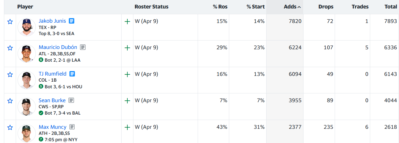 Ha-Seong Kim’s finger injury has afforded Mauricio Dubón everyday at-bats for Atlanta, and he’s seized the opportunity, hitting .350 with a pair of home runs. I don’t think you can expect that to continue, given that he hasn’t posted a 100 wRC+ in any of his previous seven seasons. But, in the meantime, he is a perfectly fine stopgap for deep leagues. His 2B, 3B, SS, OF eligibility on Yahoo plays.