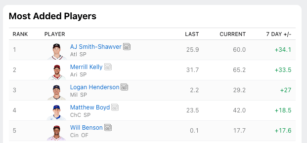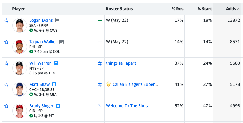Will Warren has been included in the most-added section a few times now. Nick Pollack highlighted the right-hander in Tuesday’s SP Roundup, and I dove deep into him last week. His progression is promising and makes him worth picking up universally.