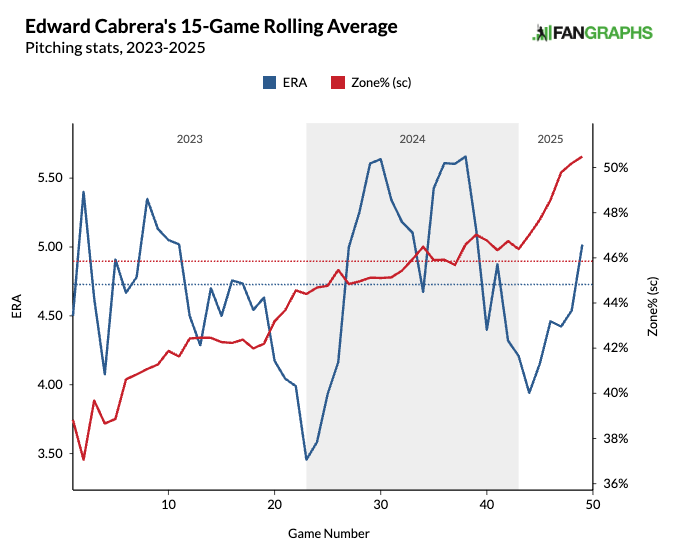 Quietly, Cabrera owns the best walk rate of his career (9.2%) as he has significantly reduced his four-seam usage to 8% on the season. Reducing four-seam usage has been part of an organizational philosophy with the Marlins. While the results and whiffs aren’t there for Cabrera, he has the best Stuff+ and command that he has ever shown in the big leagues. He is someone to keep tabs on in his next few starts.