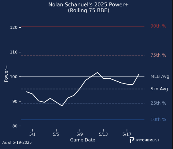 Schanuel has posted a .424 xwOBA in May while also walking more than striking out. The 23-year-old increased his bat speed by nearly three miles per hour (65.2 MPH > 68.1 MPH). While still below average, he’s starting to show better contact quality with a 39.7% HardHit% and 8.6% Barrel%. Those sorts of power numbers combined with his strong swing decisions and contact ability make him much more appealing and worthy of adding in standard leagues.