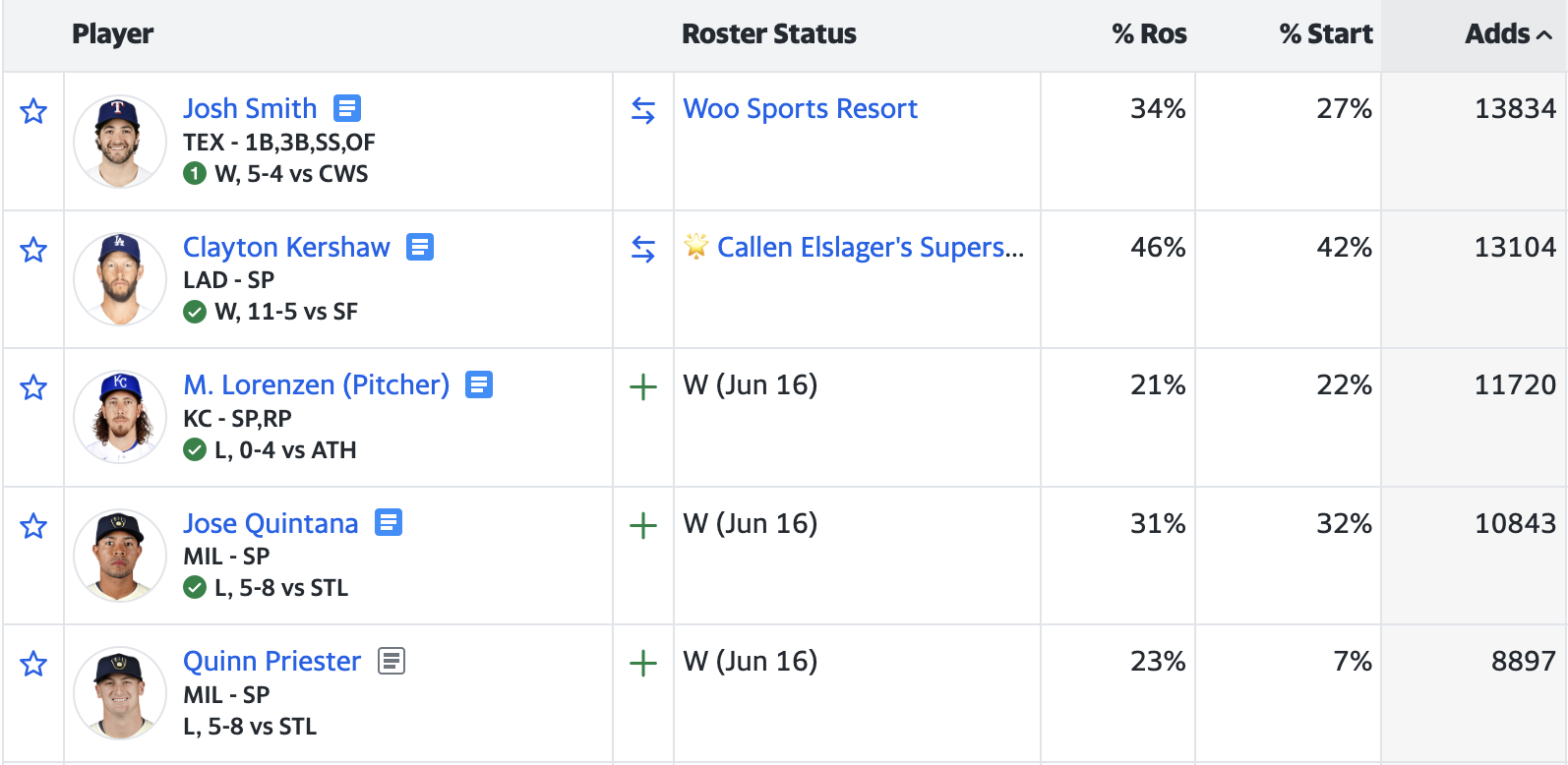 As usual, Yahoo’s list of most-added players is dominated by streaming pitchers. Three of the top five adds took the mound on Saturday: Clayton Kershaw, Michael Lorenzen, and Jose Quintana.