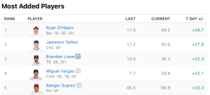 The top five most added players include two starting pitchers and three position players. Taillon and Lowe were both mentioned previously, and both deserve attention as a result of their recent performance. Ryan O’Hearn has been knocking the ball all over the diamond, and with dual eligibility at first base and the outfield, he will bring versatility to your squad. Miguel Vargas brings the same characteristic with him while also being eligible at third base. It looks as if Vargas is coming into his own this season with Chicago. Every day at-bats, a few swing adjustments, and proper confidence have fueled his surge at the plate. Suarez went 6 innings strong against Milwaukee on Sunday, giving up just two earned runs.