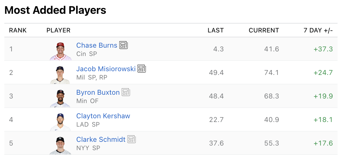The top two names on ESPN’s most-added list are two of the best pitching prospects in baseball. Jacob Misiorowski has absolutely dominated since being promoted to the majors, and he put together another excellent performance on Wednesday. He outduelled Skenes for the Pirates, picking up his third win in three starts. His xERA is a sparkling 1.84 through his first three outings, and he’s added 19 strikeouts in 16 innings. Misiorowski is almost universally rostered at this point, but if he’s somehow still available in your league, make sure to rectify that immediately. He’s all the way up to No. 29 in the Pitcher List Rankings, and that could rise even higher after Wednesday’s performance.