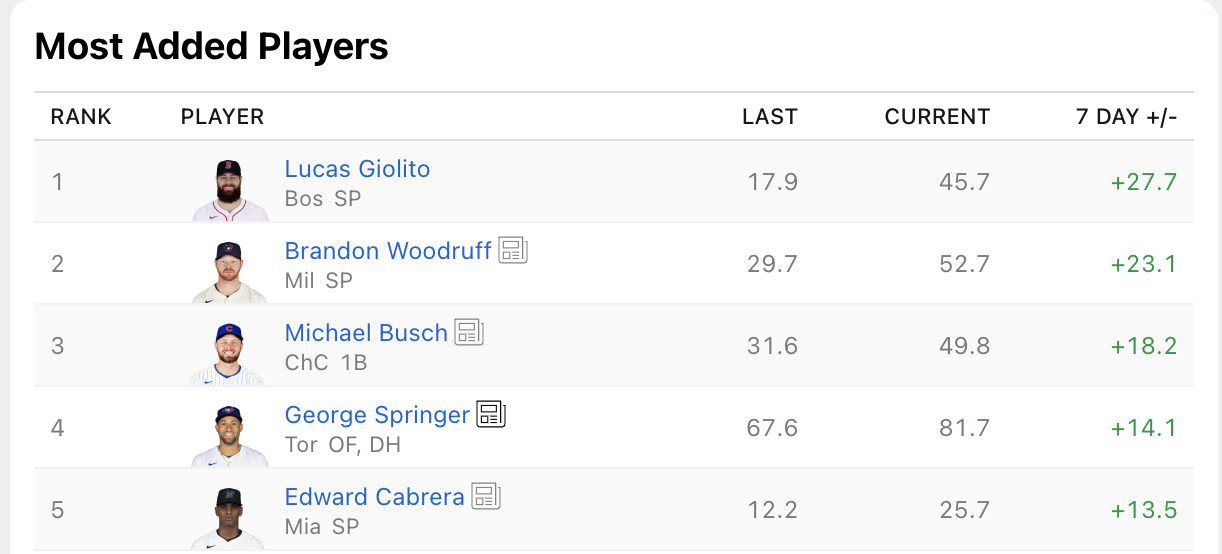 Eric Lauer was streamed against the White Sox on Wednesday and only went four innings, allowing two runs, but struck out seven, so it wasn’t too bad. Lauer has been surprisingly decent this year, but I wouldn’t trust it beyond streaming against the worst offenses, and even then, some skepticism is warranted.