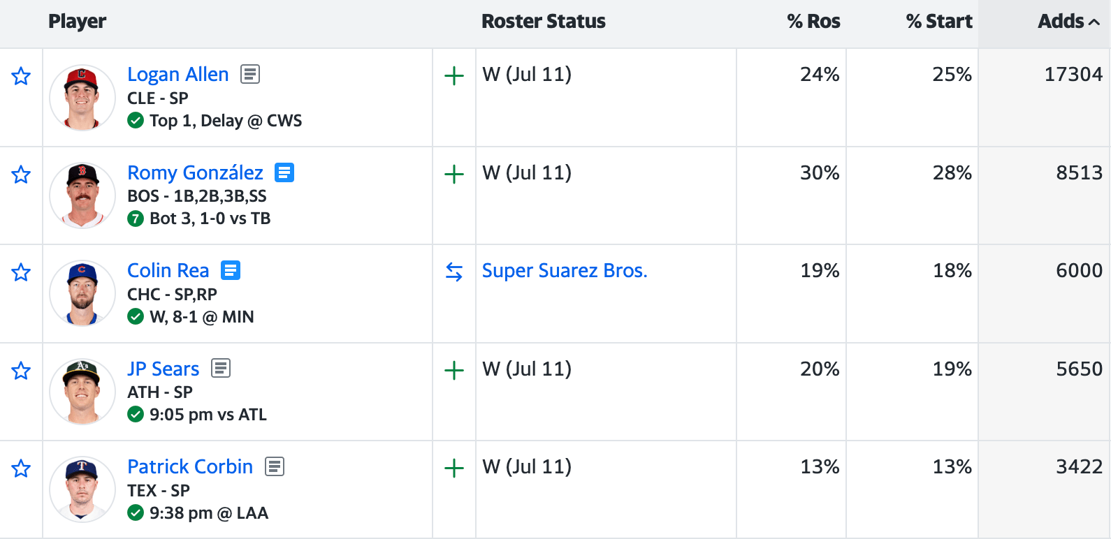 As usual, streaming pitchers dominated the listed of most-added players on Yahoo. Four of the five most-added players were scheduled to take the bump on Thursday: Logan Allen, Colin Rea, JP Sears, and Patrick Corbin. Unfortunately, Allen’s start was rained out, so he’ll start one leg of a doubleheader versus the White Sox on Friday.