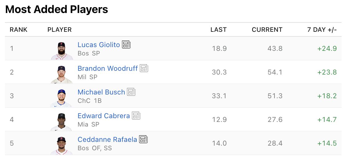 Three pitchers were also included in ESPN’s list of most-added players. Lucas Giolito has had success since joining Boston’s rotation, racking up a 6-1 record with a 3.36 ERA. He’s been brilliant over his past six starts, tallying five wins with a 0.70 ERA, 2.62 FIP, and an 8.72 K/9. Can he keep it up? That remains to be seen. His underlying metrics aren’t quite as impressive, but it could be worth riding out this hot streak for as long as possible.