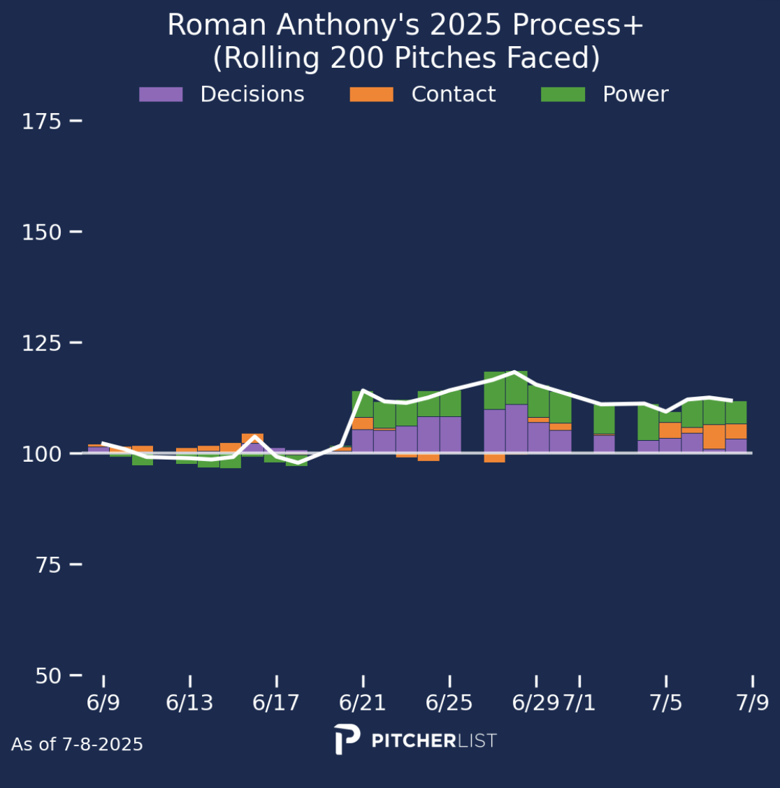 Anthony has put all those concerns to rest since then. He’s been scorching hot over his past 12 games, posting a .396 batting average while routinely hitting in the top third of the Red Sox’s lineup. The power has still yet to truly come around—he’s added just one homer in that stretch—but he has scored 12 times and driven in seven runs. Overall, his approach at the dish has been significantly improved (via Process+):