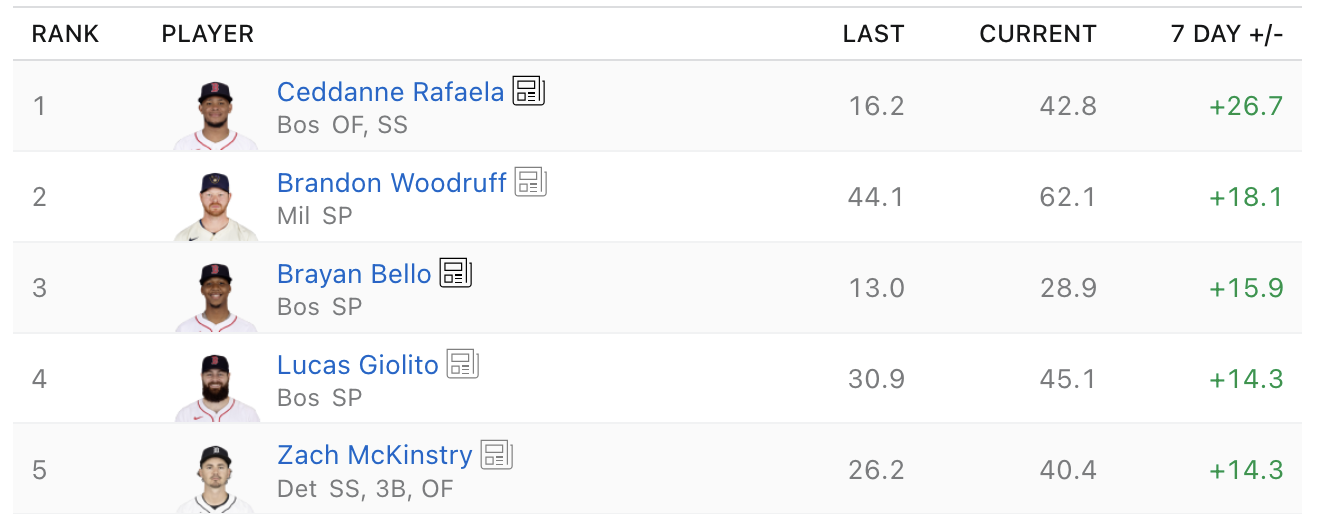 Ceddanne Rafaela is impossible to deny, on pace for a 25/25 season with a .270 average. He’s not a Statcast darling like Stowers, but he’s got enough of everything to be relevant in all leagues. It’s worth noting that most of his production (including eight of his 14 homers) has come in the last month.