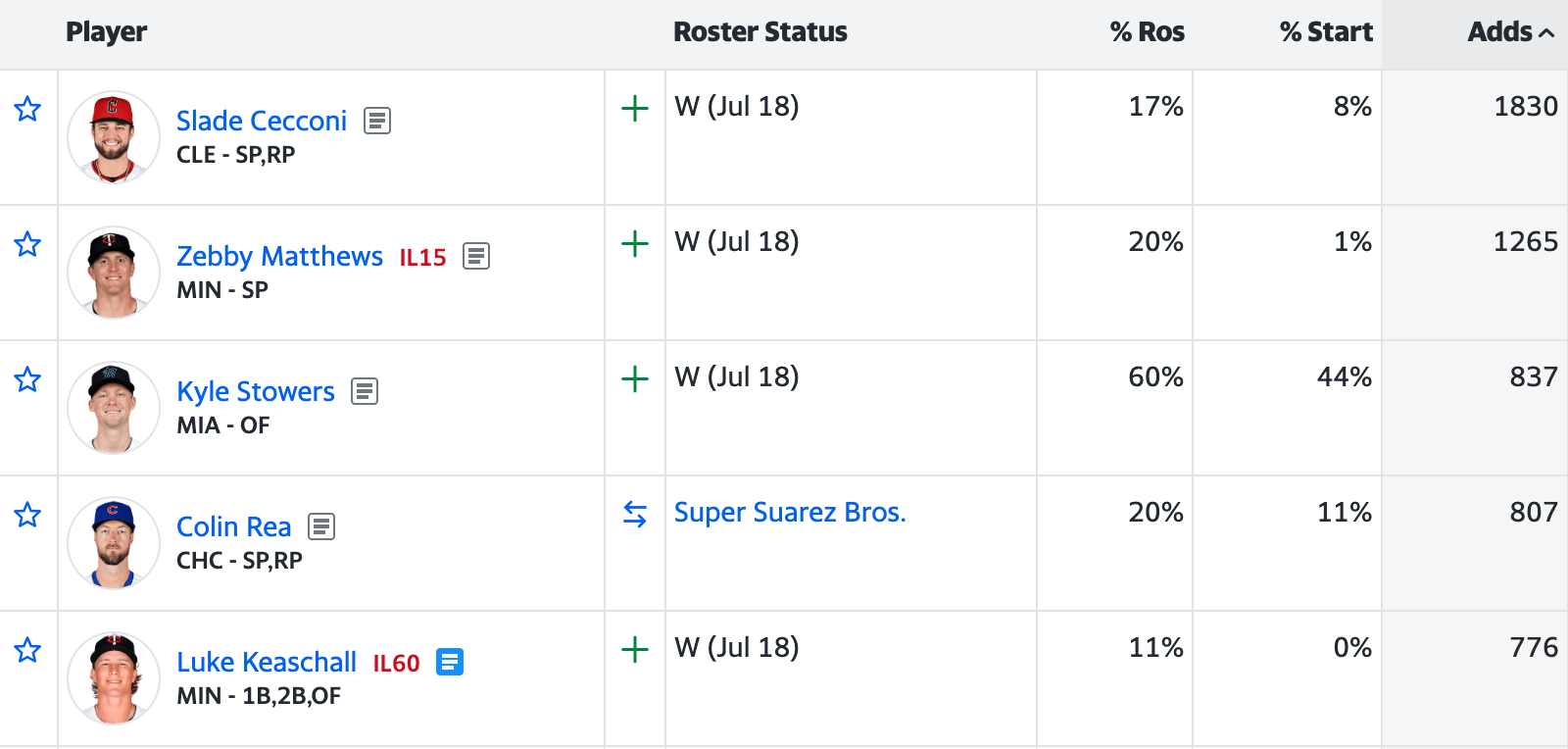 Zebby Matthews was the other pitcher among the top-five most added, and he’s a worthwhile IL stash if you have a spot available. He made a rehab start on Sunday and was extremely impressive, racking up nine strikeouts with zero walks and one hit in just four innings of work. He’s likely headed back to the majors shortly, and he has the stuff to succeed at that level immediately.