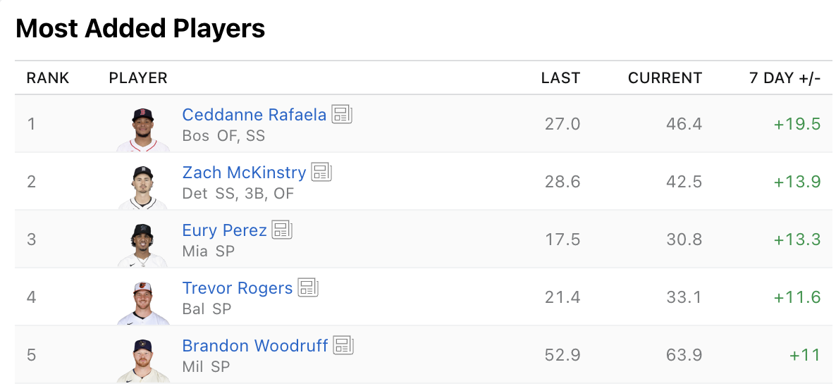ESPN’s list of most-added players also features three pitchers, including the aforementioned Perez. Trevor Rogers and Brandon Woodruff are the other two, and both players have upside for fantasy purposes.