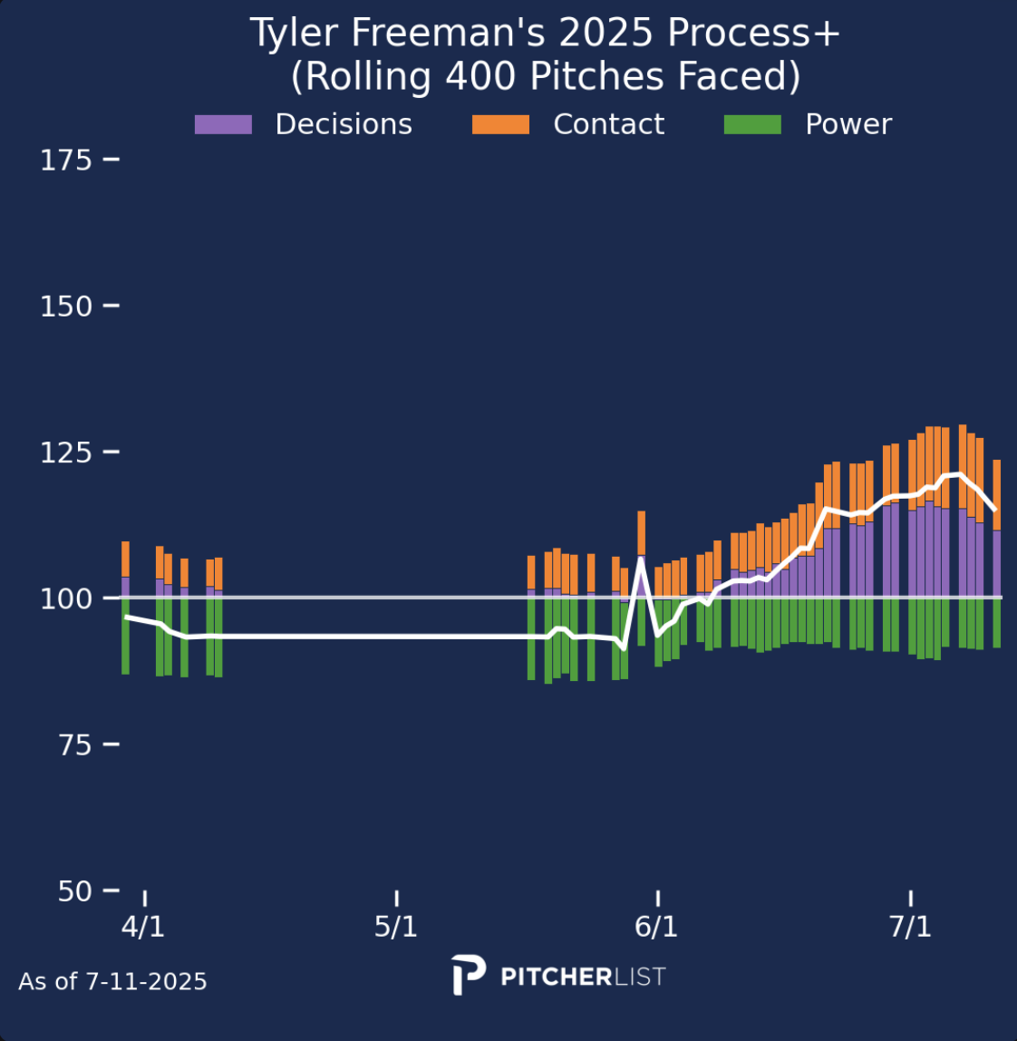 He’s not providing a ton of power, but the average seems pretty legit. His xBA for the year is above .300, and he’s made solid strides since the beginning of the season from a contact and decision-making standpoint (via Process+):