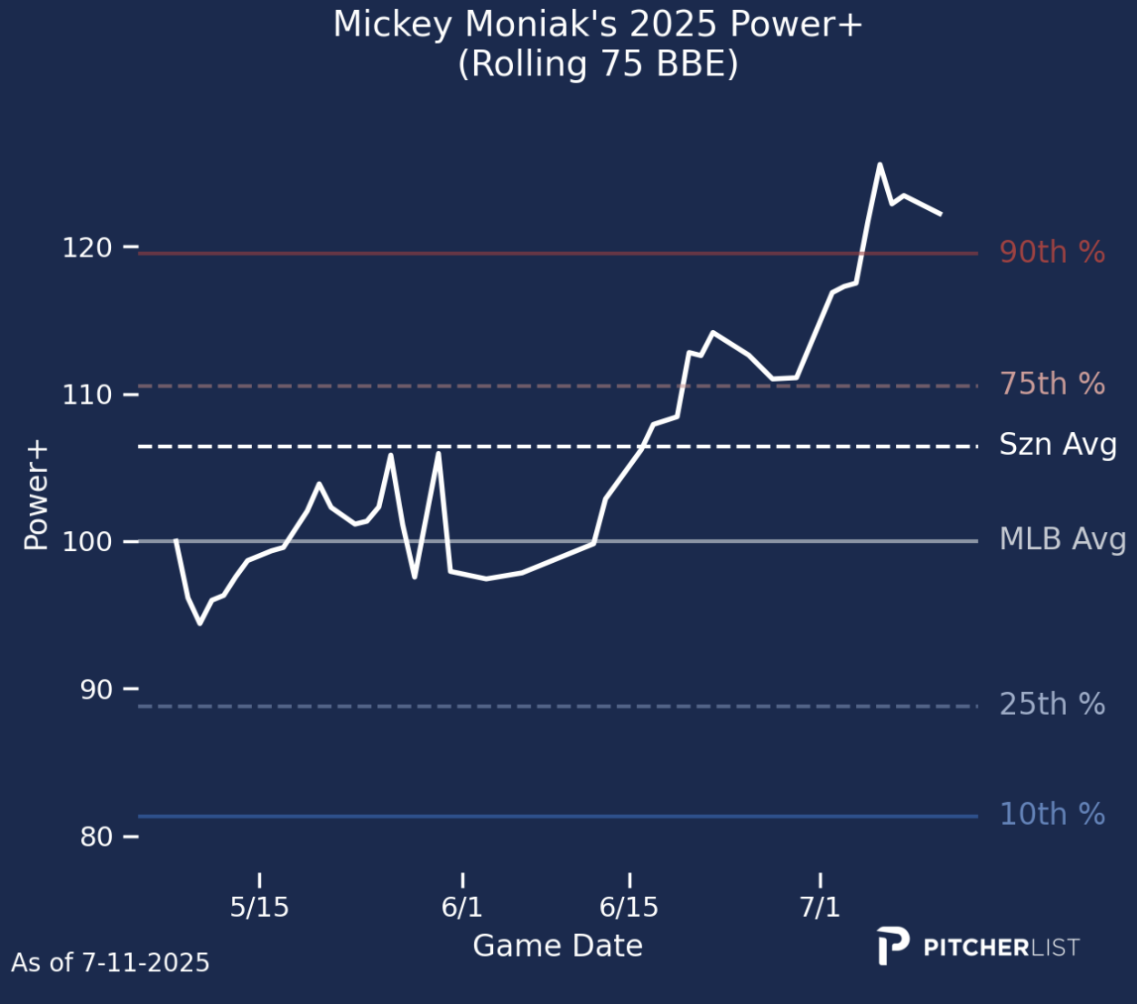 Moniak launched six homers in June and has added two more in July, and he’s not just a one-trick pony, either. Moniak has also proved a .359 batting average since June 6, resulting in a 1.219 OPS overall.