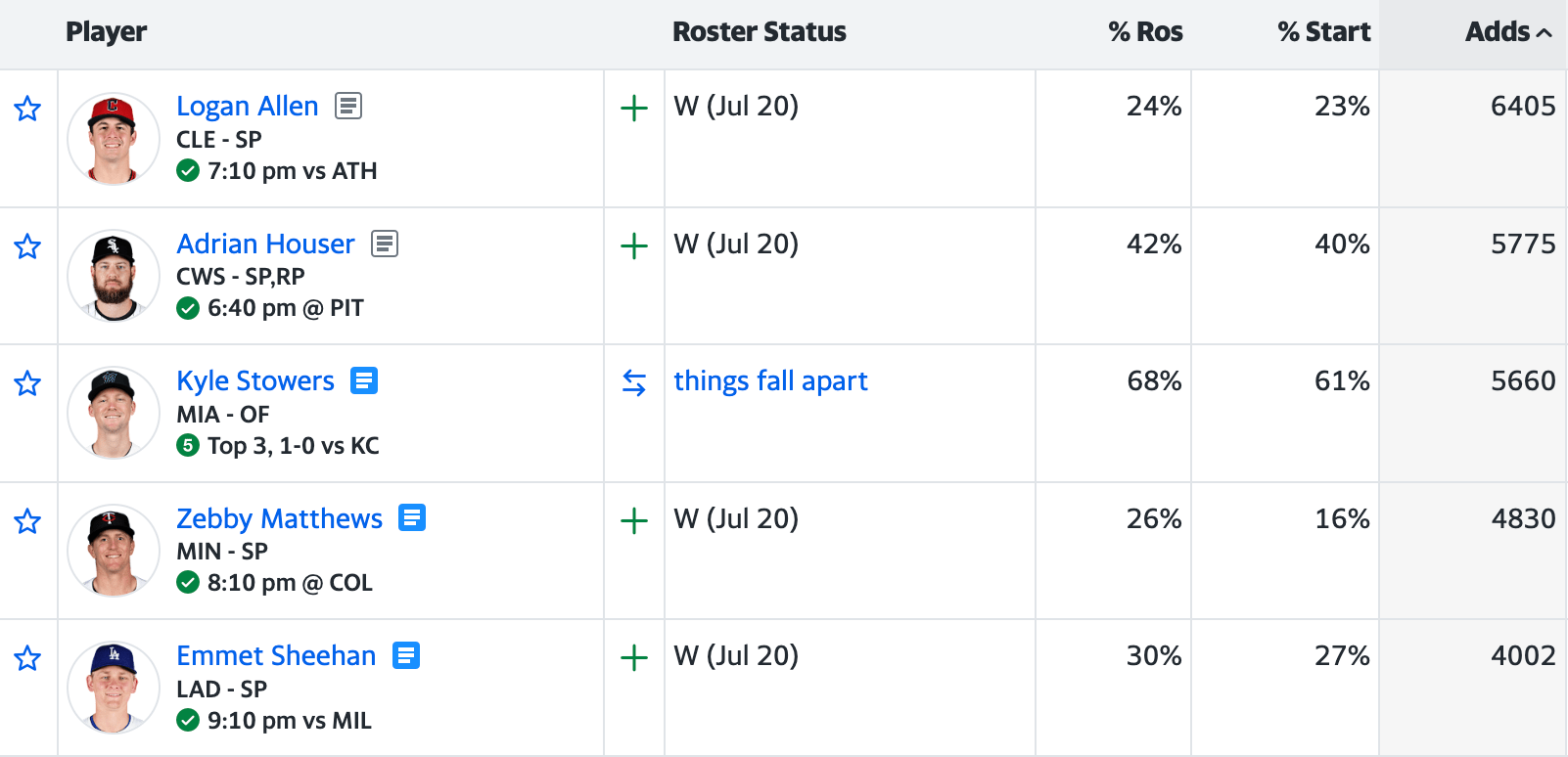 As usual, Yahoo’s list of most-added players is dominated by streaming pitchers. Four of the top five options took to the mound on Saturday: Logan Allen, Adrian Houser, Zebby Matthews, and Emmet Sheehan.