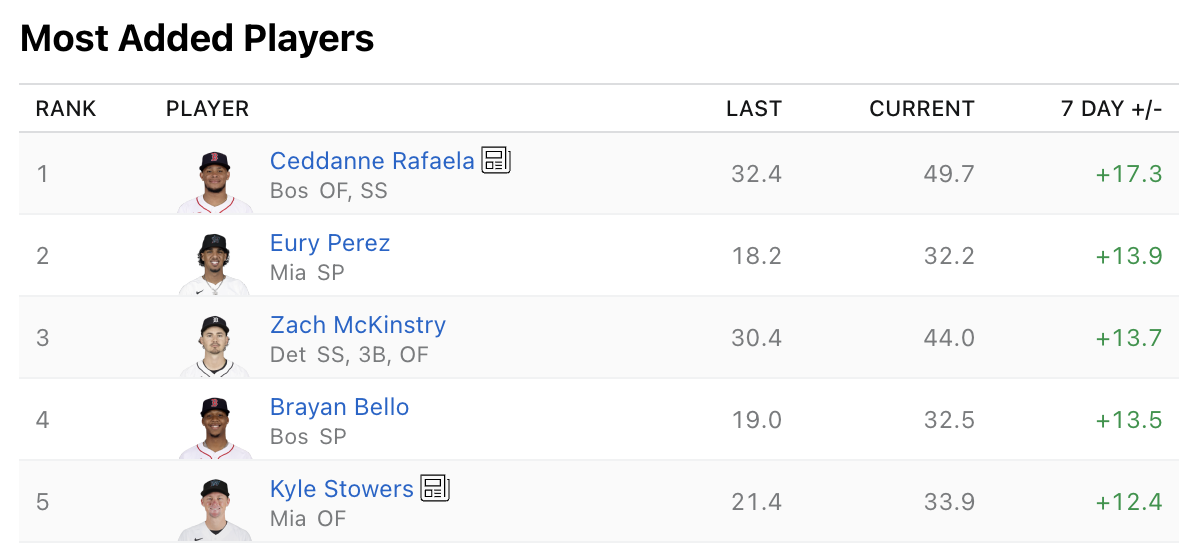 ESPN’s list of most-added players features a lot of names we’ve touched on recently. Ceddanne Rafaela, Eury Perez, Zach McKinstry, and Brayan Bello are all repeats from Saturday’s column, so Kyle Stowers is the lone new addition. He’s heated back up after slumping in June, and he deserves to be rostered in all formats.