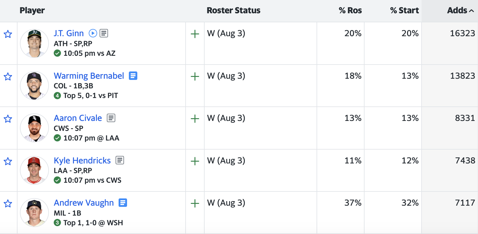 As usual, Yahoo’s list of most-added players is dominated by streaming pitchers. Three of the top five options took to the mound on Saturday: J.T. Ginn, Aaron Civale, and Kyle Hendricks.